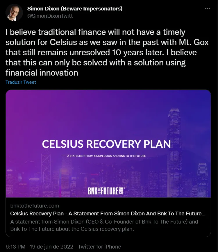 Simon Dixon, CEO da BnkToTheFuture publicou em um artigo da própria empresa, bem como no Twitter, que ele acredita que as finanças tradicionais não irão trazer uma solução imediata para a Celsius, ele continua “Como vimos no passado com Mt. Gox, que ainda continua sem soluções dez anos depois”.