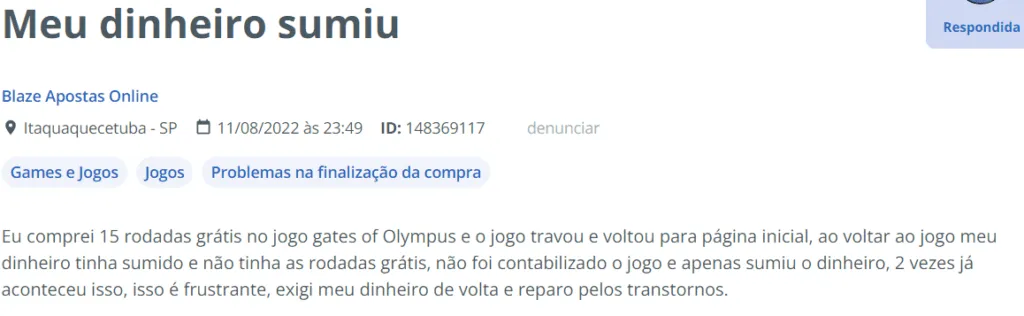 Reclame Aqui da Blaze: Dinheiro sumiu da plataforma